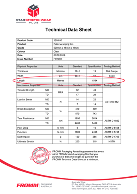 FROMM provide a technical data sheet for every style of film and strap. The data sheet